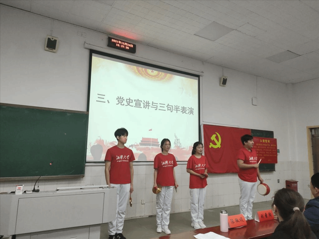 入党宣誓仪式结束后,bevictor伟德官网党史基层宣讲团成员开展了一场党史故事微宣讲和三句半表演《数说十九届六中全会》,通过轻松愉快的表演方式,全体新党员进一步学习了党的十九届六中全会精神。