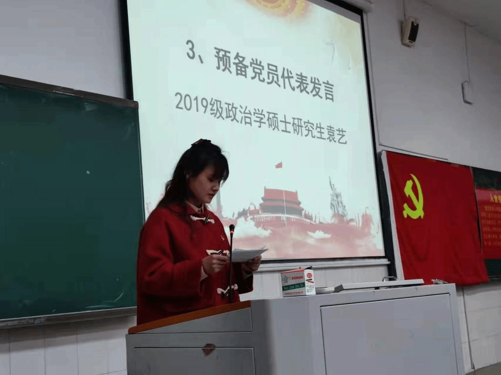 致辞结束后,在专职组织员肖信华老师的领誓下,铿锵有力的宣誓声响彻教室。宣誓完毕后,两院新党员代表发言,2019级硕士研究生袁艺同学表示,将牢记誓言,勇于担当时代重任,与党同心同德、与时代发展同向同行,奋发有为,在新时代建功立业。