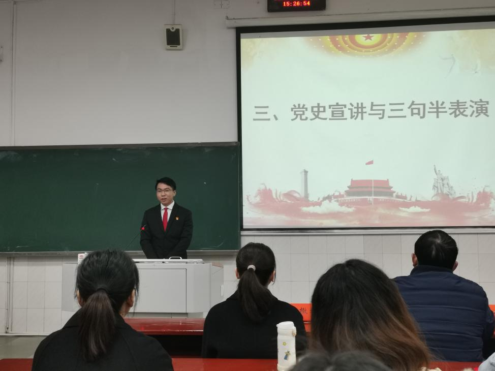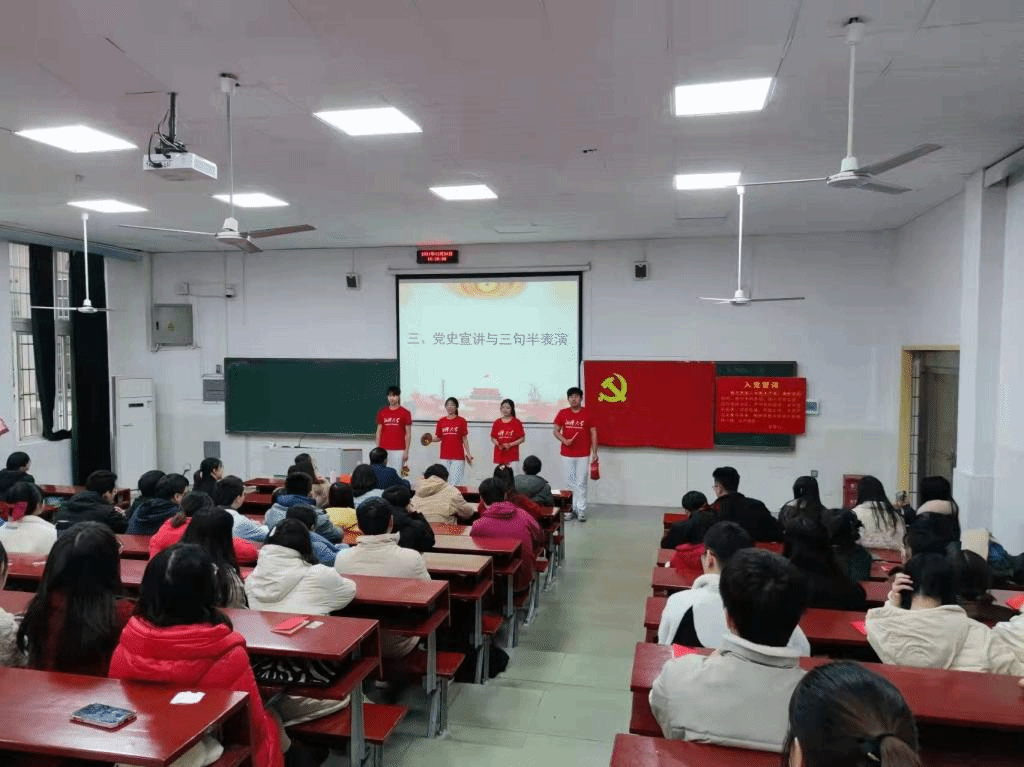 张欣同志这段饱含感情地宣讲感动了全场同志,在宣讲末尾张欣同志说,他希望通过讲述叶挺将军入党的故事激励各位新党员守初心、明使命,坚定遵守党员誓词,坚决履行永不叛党的铿锵誓言!最后由王昊仲、朱钊磊、王雪莹、崔煜华四名同志为大家带来生动地三句半表演—《数说十九届六中全会》,在锣鼓镲的加持下,让人眼前一亮,增添了学习的趣味性,引起了全场阵阵掌声。