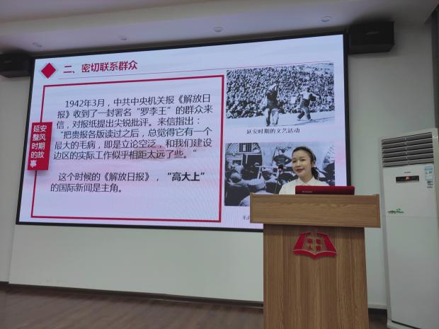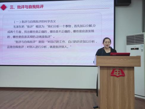 最后,彭依依引用毛泽东“房子和脸”的形象比喻阐述了批评与自我批评的含义,并以陕甘宁边区时期毛泽东妥善处理群众批评的事例展示了共产党是如何进行自我批评的。同时还介绍了批评与自我批评的作风如何在党内萌芽、成熟并以制度的方式确定下来并延续至今;列举了新时代党内批评与自我批评的各项举措。讲解了个人及党应如何加强批评与自我批评,批评与自我批评应该“红红脸、出出汗”,而不是流于形式。