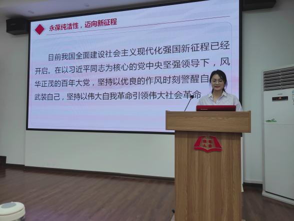 谢敏首先以党的作风建设纪录片第一集《承诺与期盼》中的节选视频作为导入,讲解党关于作风建设的承诺和期盼由何而来,去往何方。她指出,在党的七大上我们党第一次明确把理论联系实际、密切联系群众和批评与自我批评确立为党的三大优良作风,标志着我们党三大优良作风正式形成。她强调三大优良作风是我们党付出极大的努力和代价培育起来的,对中国革命和建设的胜利起了至关重要的作用,是我们党一刻都不能丢的传家宝。