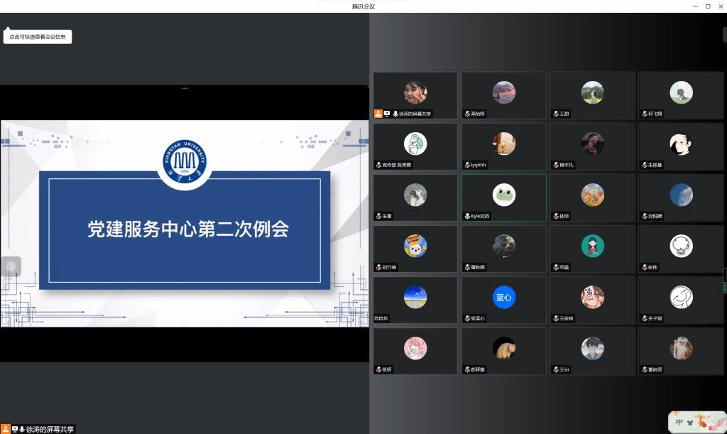 会议开始,各部门分别就本部门工作展开分享学习。组织部组长彭驿雅通过录屏讲解党组织关系转接和党费缴纳两个方面的工作;宣传部三位新成员展示了稿件审核以及稿件发布的过程及注意事项;办公室组长张妍介绍了值班表格制作和文件整理等办公室工作;党课培训部组长王甜就党课培训活动的开展和发展党员过程中的材料交纳展开详细的论述。