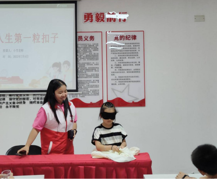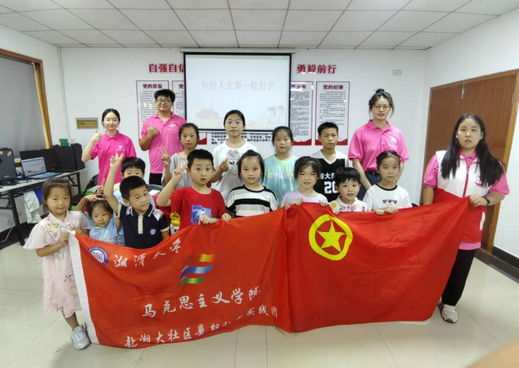 为深入学习贯彻落实习近平总书记关于“大思政课”建设的重要指示批示精神,引导和帮助广大青年学生在与现实相结合的“大思政课”中“受教育、长才干、作贡献”,提升青少年儿童综合素质,培养担当民族复兴大任的时代新人。2023年7月4日,bevictor伟德官网,伟德国际1946赴湘大社区暑期社会实践团(成员:焦传秋、王黎斌、甘慧娜、胡佳琦、胡嘉妮、李猛、郭雪、张钰苒、罗嘉怡、谭雨璇;指导教师:肖信华)在湘大社区开展了一场以“扣好人生第一粒扣子、争做新时代好少年”为题的三下乡暑期公益课堂活动。