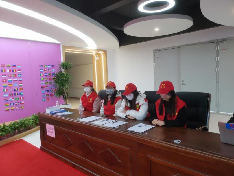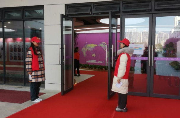 活动开始之前,13名志愿者分为三组开展引导工作。在会场外,7名志愿者负责从学校门口分段引导嘉宾入场,为需要照顾的残疾朋友们提供帮助,将其引导至会场入口。在会场入口,2名志愿者将嘉宾引导至签到处,其余4名志愿者组织签到工作,协助嘉宾有序进入活动现场。