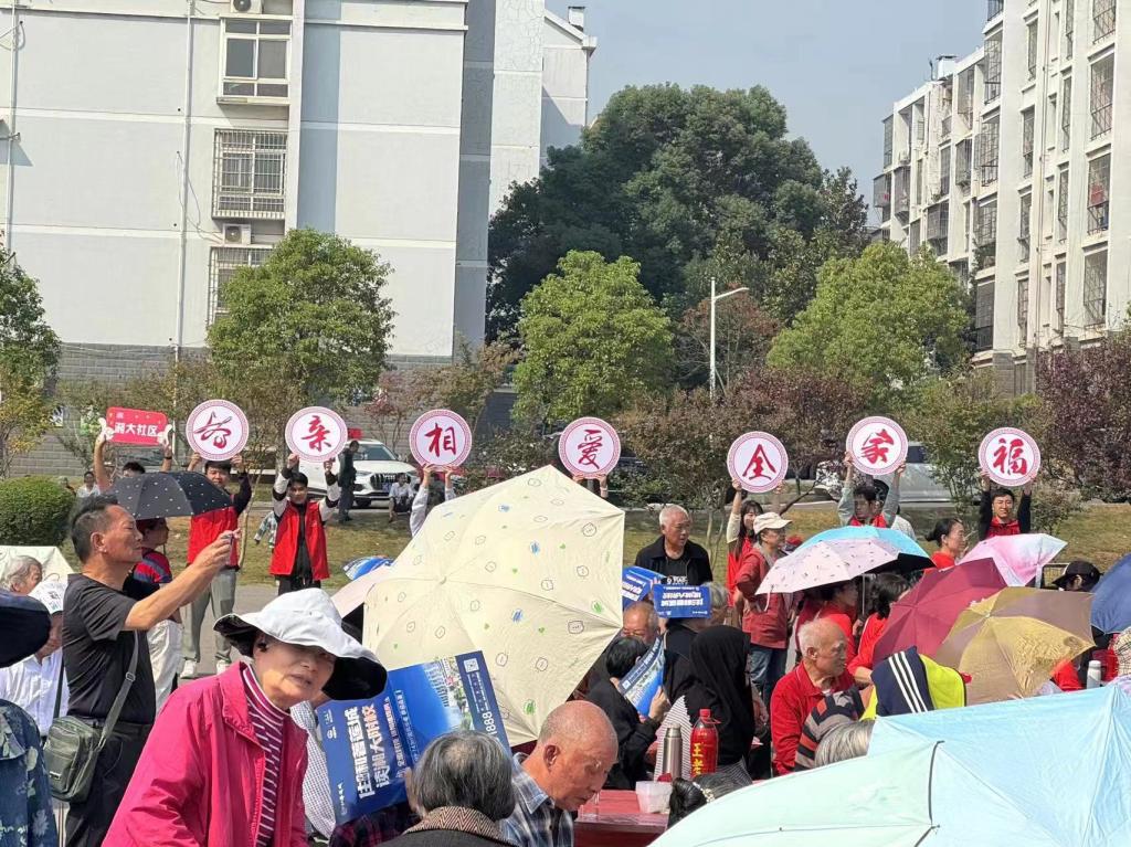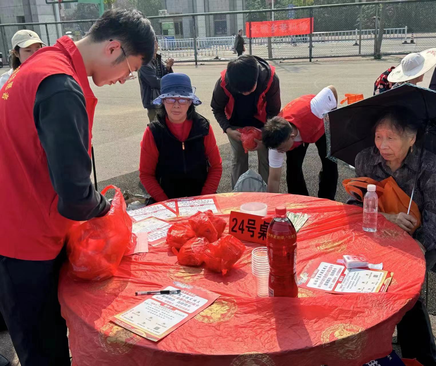 活动当天,志愿者们身穿统一的红色马甲,早早地聚集在湘大社区中心广场。他们不仅帮助布置现场,摆放了四十余张餐桌椅,准备了400多份精心挑选的小礼品,还积极与老人们互动,耐心地讲解各种实用的生活小知识。从养老保险政策到日常生活中如何防范火灾隐患,再到食品安全的重要性,志愿者们用实际行动诠释了“老吾老以及人之老”的传统美德。