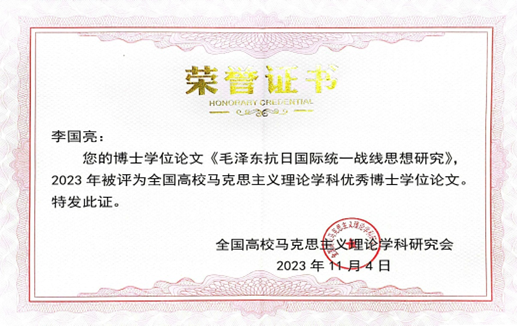 11月5日,2023年全国高校马克思主义理论学科优秀博士学位论文颁奖仪式在安徽师范大学举行,bevictor伟德官网2020届博士毕业生、青年教师李国亮的博士学位论文《毛泽东抗日国际统一战线思想研究》获奖,其指导教师为唐正芒教授。