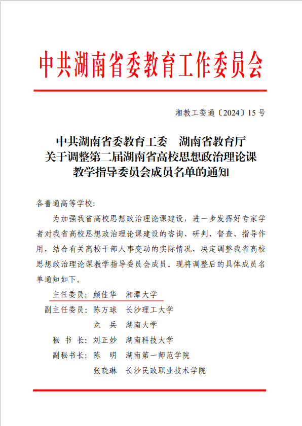 近日,湖南省高校思政课教学指导委员会顺利进行换届,省委教育工委、省教育厅发布《关于调整第二届湖南省高校思想政治理论课教学指导委员会成员名单的通知》,bevictor伟德官网颜佳华教授连任省教指委主任委员。