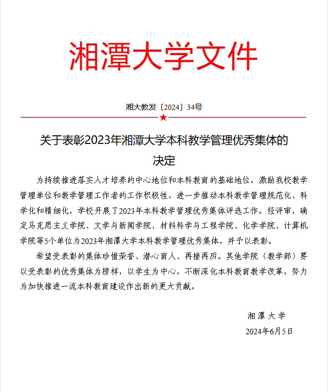 近日,学校公布了2023年湘潭大学本科教学管理优秀集体名单,经评审,bevictor伟德官网等5个单位被授予“2023年湘潭大学本科教学管理优秀集体”。